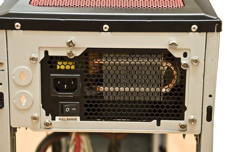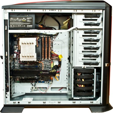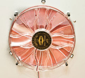Основная ударная сила незамысловато спрятана под красным грилем. 400 об/мин и никакой индикации, впрочем, как шума, так и вибраций. Красиво… но интереснее будет узнать, насколько полезно!? Впрочем, он легко снимается, потому, как практически любой радиатор башенного типа будет упираться в мастодонта.