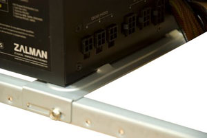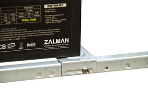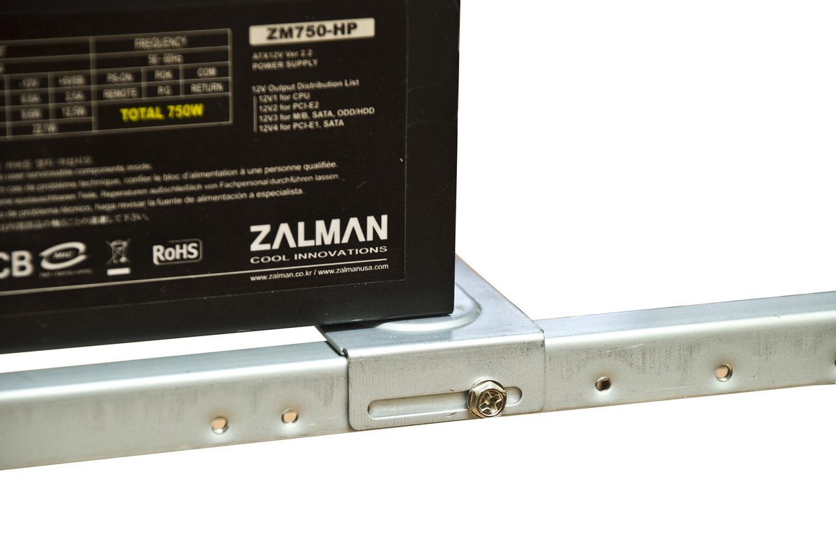 Стандартной длины блоки питания как раз удачно подпираются специальной планкой, а упоры не дают блоку питания сдвинуться во время закручивания винтов с наружной стороны.