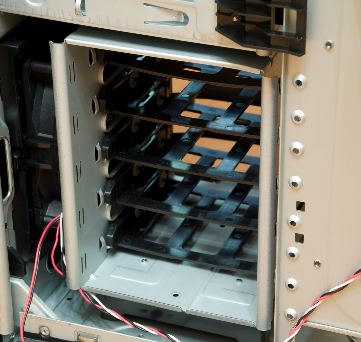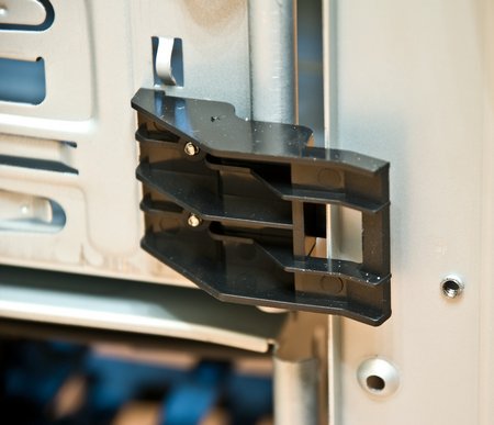 Пластиковые салазки лотка материнской платы, «рессорные» упоры заглушек, резиновые поставки для HDD. Основные источники вибрации - это вентиляторы и приводы, если удается гасить их колебания, то вибрация не распространятся по всему корпусу. С другой стороны, сама конструкция иногда способствует созданию дополнительных источников вибрации, поэтому в нашем случае миллиметровая сталь абсорбирует их.