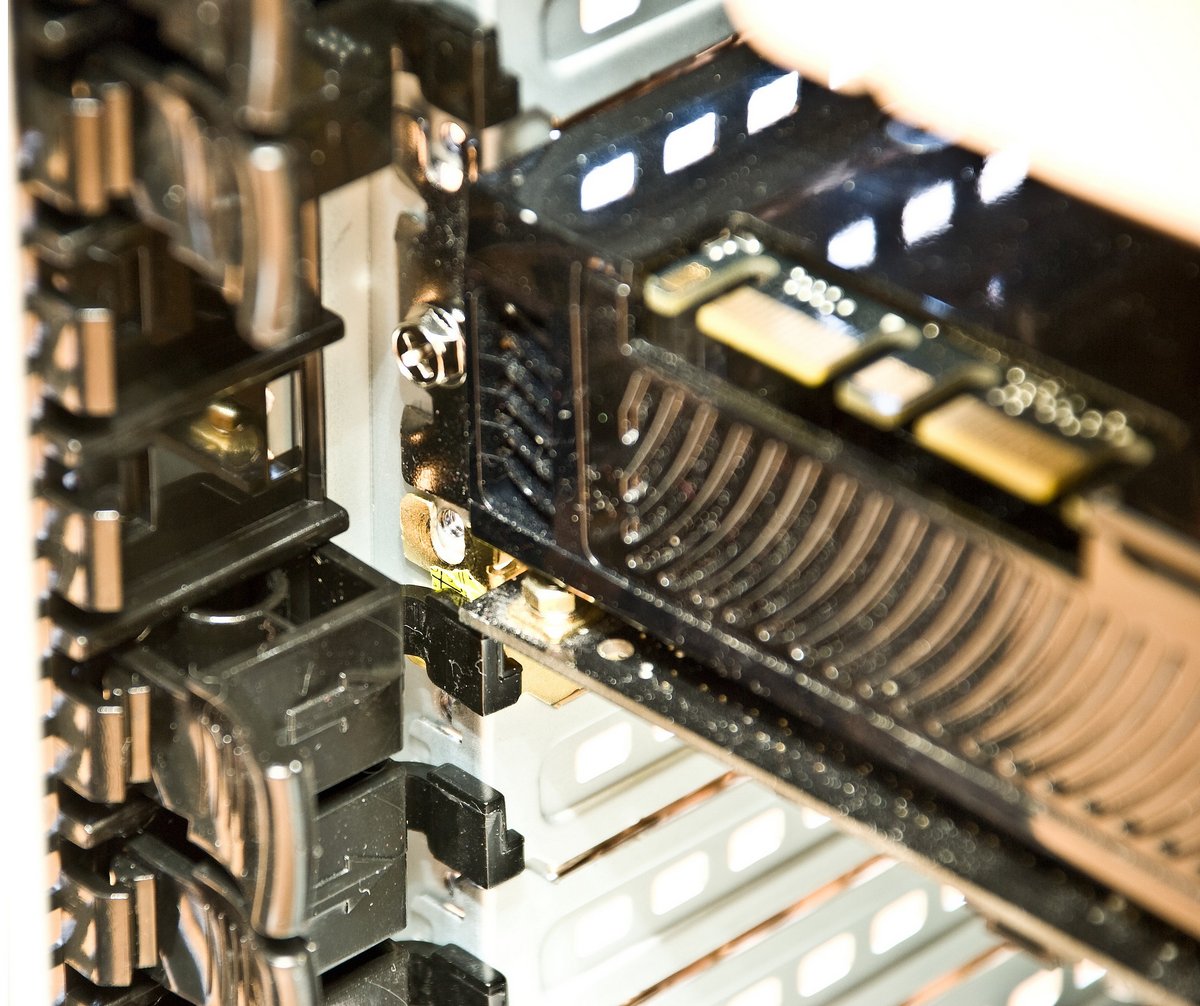 Наглядная демонстрация невозможности использования фиксаторов из-за габаритов системы охлаждения видеокарты… на помощь приходят стандартные винты. Чуть ниже, для примера, установлена аудиокарта.