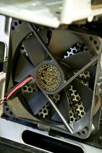 В самом корпусе установлены три весьма посредственных по качеству вентилятора. Все они рассчитаны на работу при 1900 об/мин, но, благодаря датчику температуры, могут изменять обороты от 800 до максимальных.