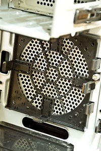 Весело и быстро – Ascot… Вынимаем вентилятор, раздвигаем упоры и «вуаля». Прекрасный фокус, и никаких отверточных операций, превращение крепления 120->140мм за считанные секунды. Заметьте, передний вентилятор оснащен фильтром, а вытяжные - нет. Но менять его ужасно сложно и неудобно. Необходимо демонтировать переднюю облицовку корпуса.