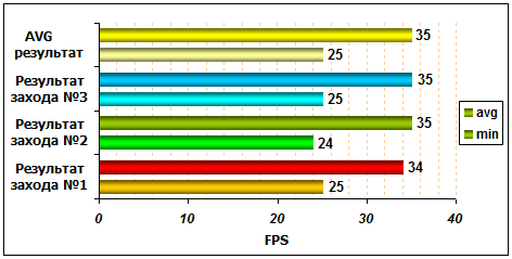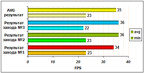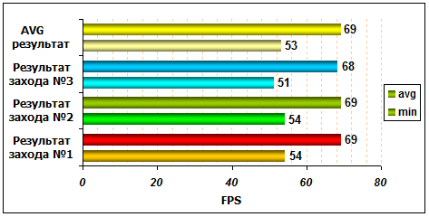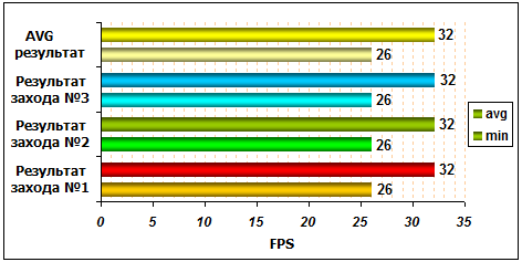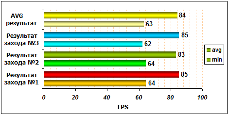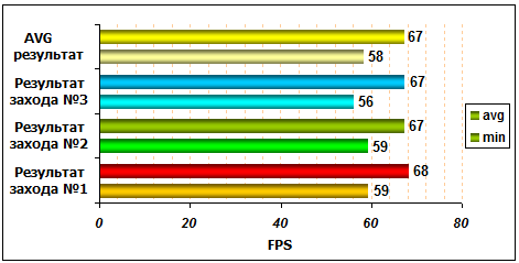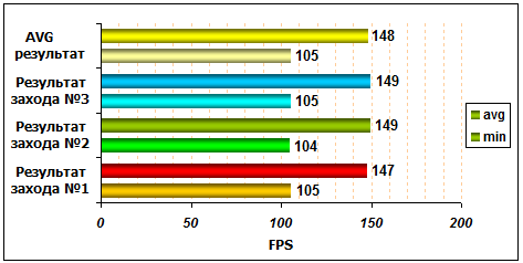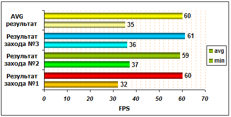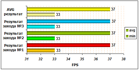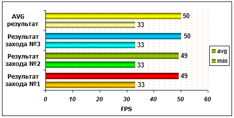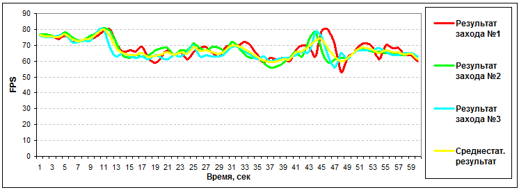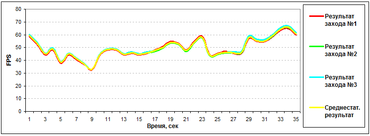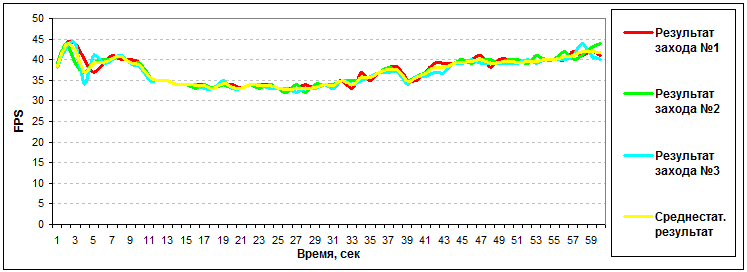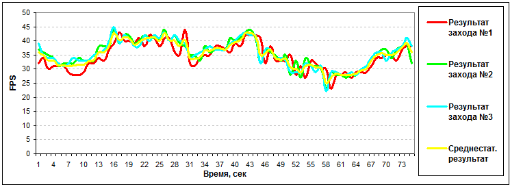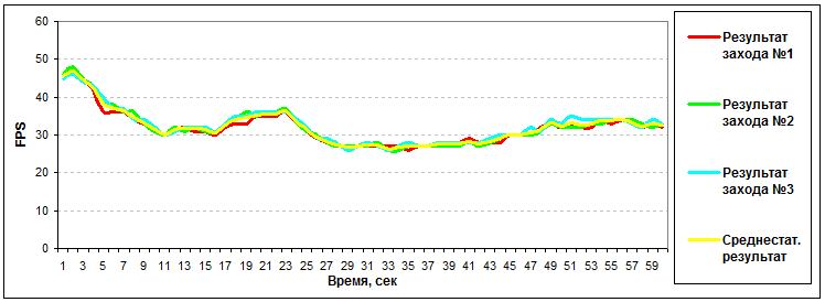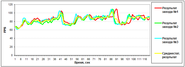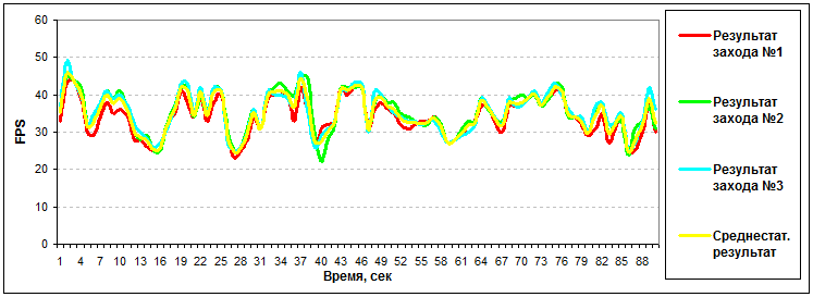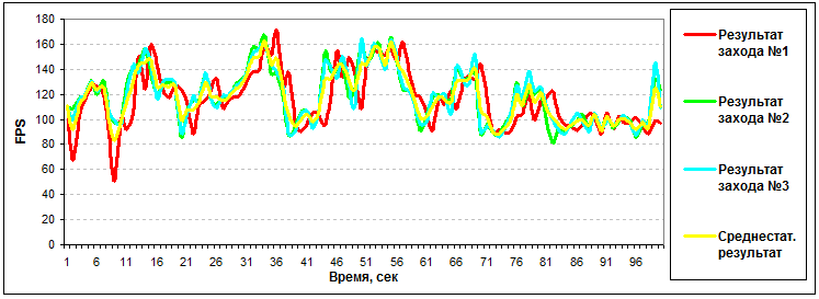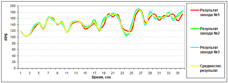 Взглянув на график распределения FPS по времени, мы видим, что о повторяемости трех заходов говорить не приходится. Все три кривые идут в разный промежуток времени, но их амплитуда одинакова. Но все же максимальная разница avg fps в трех заходах равна 2%. Эта погрешность является не критичной.