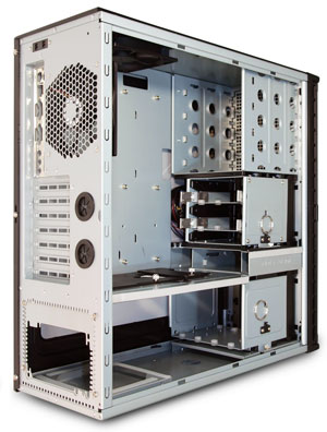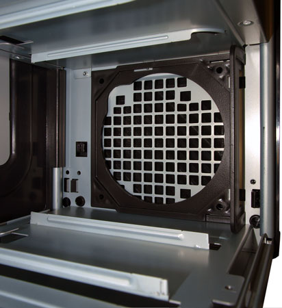 Передняя панель под дверцей полностью пластиковая. На ней располагаются четыре 5.25"-отсека и две большие вентиляционные решетки, разделенные одним 3.5"-слотом. Вся панель "дырявая". Вентиляционные решетки являются дверцами: они открываются в сторону при нажатии. В решетках установлены пылевые фильтры. Открыв их, пользователь получает доступ к креплению фронтальных вентиляторов. Таким образом, спереди на вдув установить можно две "стодвадцатки", которые попутно будут обдувать жесткие диски. Но стандартная поставка корпуса наличия фронтальных вентиляторов не предусматривает. Соответственно поступать внутрь воздух будет через любое отверстие. Все большие — на передней панели — снабжены пылевыми фильтрами. Но остальные, включая явно сделанные для вентиляции отверстия в заглушках карт расширения (зачем они там вообще — вот главный вопрос), — нет. О защите от пыли в такой ситуации можно говорить только с большой натяжкой. По крайней мере, до установки вентиляторов на вдув, выравнивающих давление.