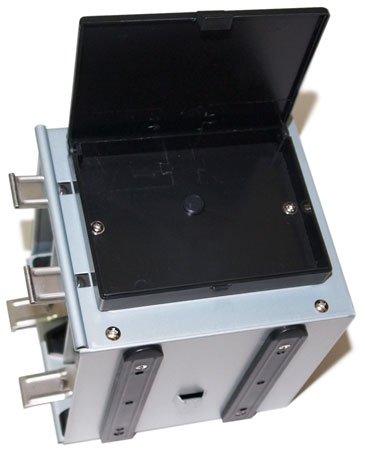Также в передней части нижнего отсека располагается корзина для жестких дисков. Она рассчитана на три винчестера с вертикальным расположением.