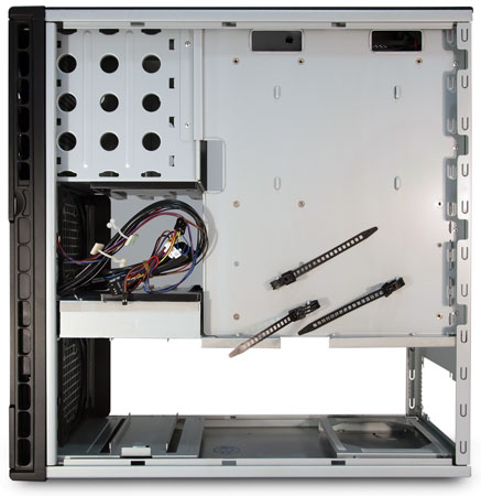 За поддоном находится еще одна фирменная особенность серии корпусов Antec Performance One: система организации кабелей (cable management). Кругом отверстия для вывода туда проводов и многоразовые пластиковые стяжки. А вырезы в верхней части поддона, в том месте, где у большинства материнских плат находится разъем питания процессора, действительно облегчают нелегкую судьбу сборщика.