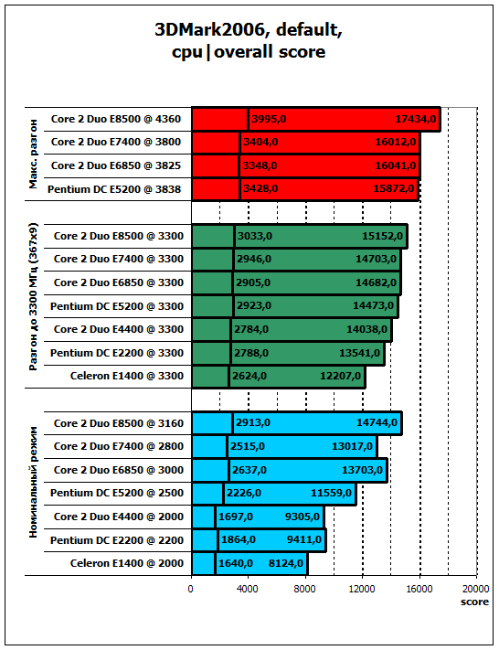 В процессорной части теста 3DMark06 наблюдается близость результатов, и стоит отметить, что E1400 хотя и не существенно отстает в CPU тесте от E2200 и E4400, однако по общему количеству «попугаев» проигрывает им довольно существенно.
