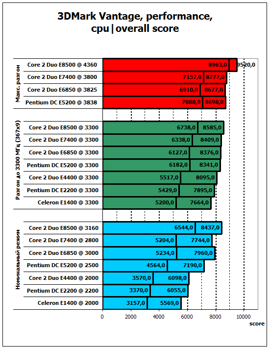 Современное творение от Futuremark в лице 3DMark Vantage оказывается более процессорозависимым, чем рассмотренный ранее 3DMark06. Как обычно, E8500 оказывается на первом месте, хотя отрыв от соперников и не столь существенен, но отрицать его преимущество над E7400 нельзя. Вообще, 45-нм процессоры выступают более достойно, нежели их 65-нм собратья. E5200 оказывается быстрее не только E4400, но и более дорогого E6850, причем и при одинаковой частоте, и при максимальном разгоне. Стоить отметить, что количество "марков", полученных E8500 в CPU тесте выше, чем их общее количество за весь тест у любого другого процессора.