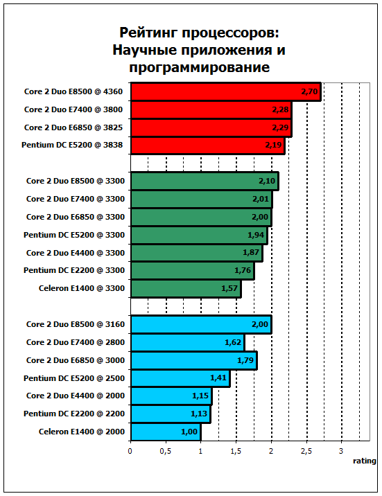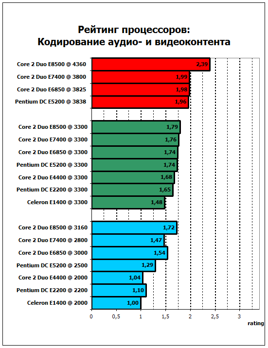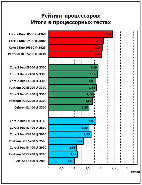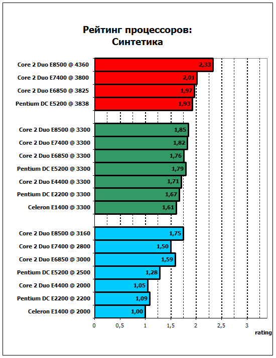 В номинальном режиме работы оказывается важнее всего тактовая частота. При одинаковой частоте невозможно не отметить мизерное преимущество Pentium Dual-Core E5200 над Core 2 Duo E6850, который проигрывает Core 2 Duo E7400. Единоличным победителем становится Core 2 Duo E8500. Pentium Dual-Core E2200 уверенно занимает нишу между Celeron E1400 и Core 2 Duo E4400, который серьезно проигрывает своему принципиальному сопернику Pentium Dual-Core E5200.