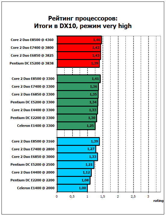 Расположение процессоров несколько другое, чем было получено нами ранее. Core 2 Duo E6850 уверенно побеждает Pentium Dual-Core E5200 как в номинальном, так и в остальных режимах, а также идет наравне с Core 2 Duo E7400. Безоговорочным лидером является Core 2 Duo E8500. Не кажется случайными отставание Core 2 Duo E4400 от Pentium Dual-Core E5200 и победа над Pentium Dual-Core E2200.