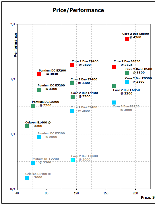 Данный график не должен вызвать серьезных вопросов, однако во избежание недоразумений поясним, что по оси X отложена цена процессора (чем правее - тем дороже), а по оси Y - производительность относительно нашего двоечника Celeron E1400 (чем больше значение - тем большим быстродействие обладает процессор; значение 1 соответствует производительности Celeron E1400 в номинальном режиме работы, значение 2 говорит о двукратном преимуществе над Celeron E1400 в быстродействии). Для удобства ориентирования сохранена цветовая маркировка режимов процессоров. Соответственно, процессор, оказывающийся в левом верхнем углу, является наиболее выгодной покупкой :-).