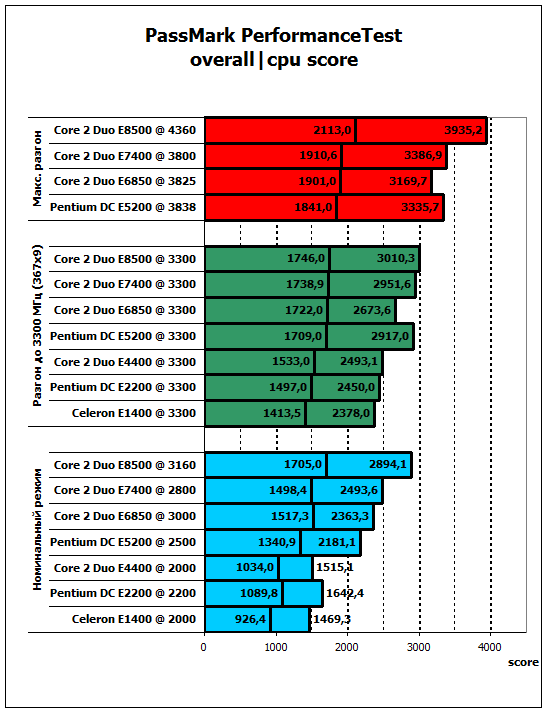 В стареньком, но не теряющем актуальности бенчмарке от Futuremark процессоры располагаются преимущественно в зависимости от тактовой частоты. При одинаковой частоте только один из них является явным аутсайдером - E1400. Обрезанный до 512 Кб кэш является серьезным ограничением. E2200 занимает промежуточное положение между парой E4400/E5200 и Е1400.