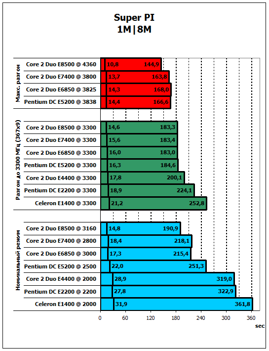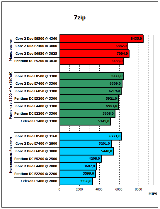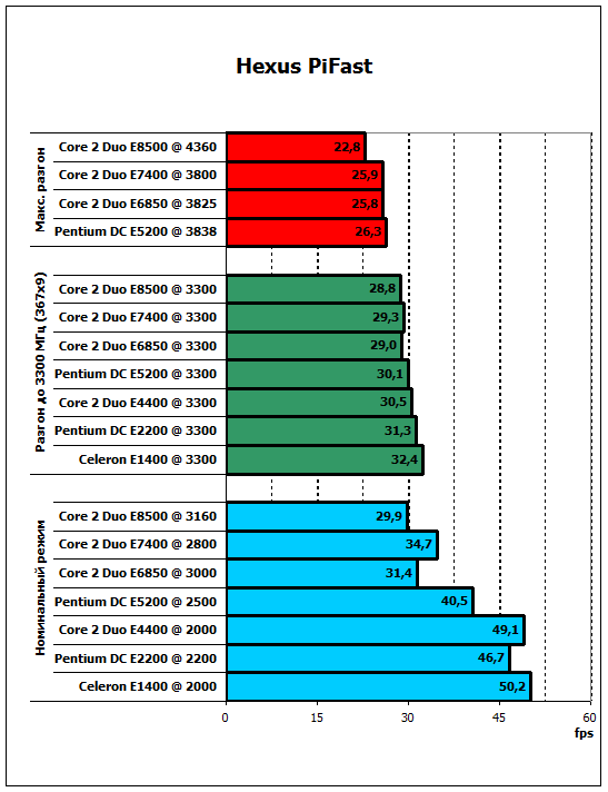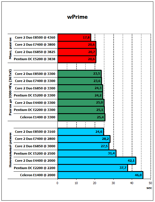 Как видно из результатов, Core 2 Duo E6850 реабилитируется и опережает E5200, а отставание от E7400 составляет чуть более 1%, что можно списать на погрешность.