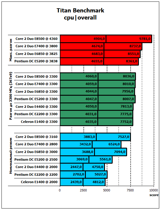 Результаты, полученные в Titan Benchmark, являются ожидаемыми, а вот остальные - нет! В первом и третьем тесте заметно подавляющее преимущество 45-нм процессоров. Pentium Dual-Core E5200 оказывается настолько быстр, что не только может успешно конкурировать с Core 2 Duo E4400, но и даже обходить E6850! Видимо, ситуация, возникшая при тестировании в PassMark PerformanceTest, не является случайной.