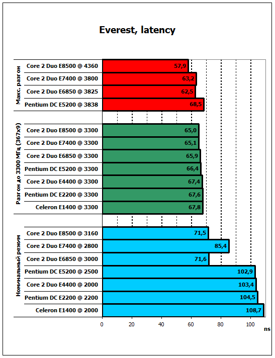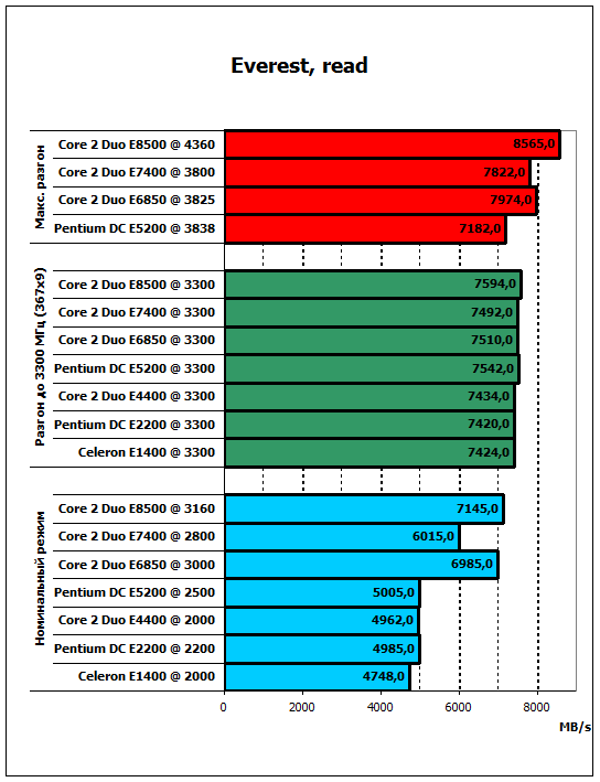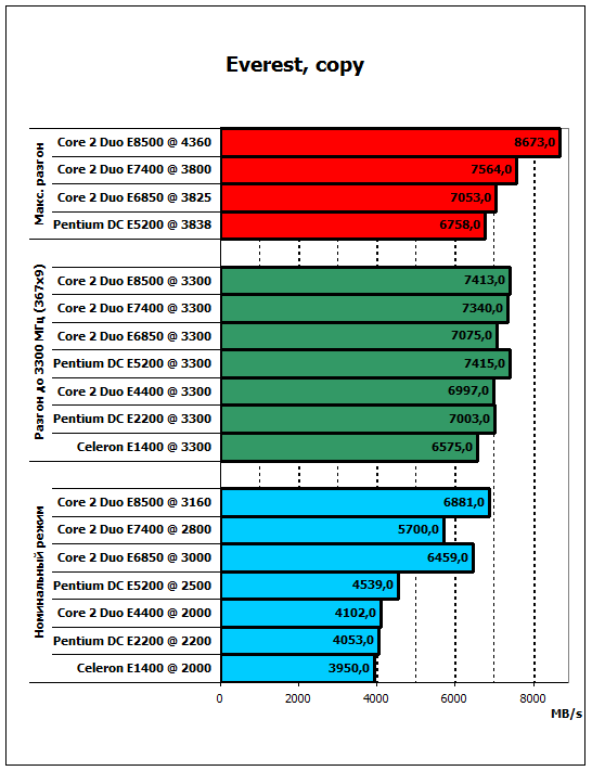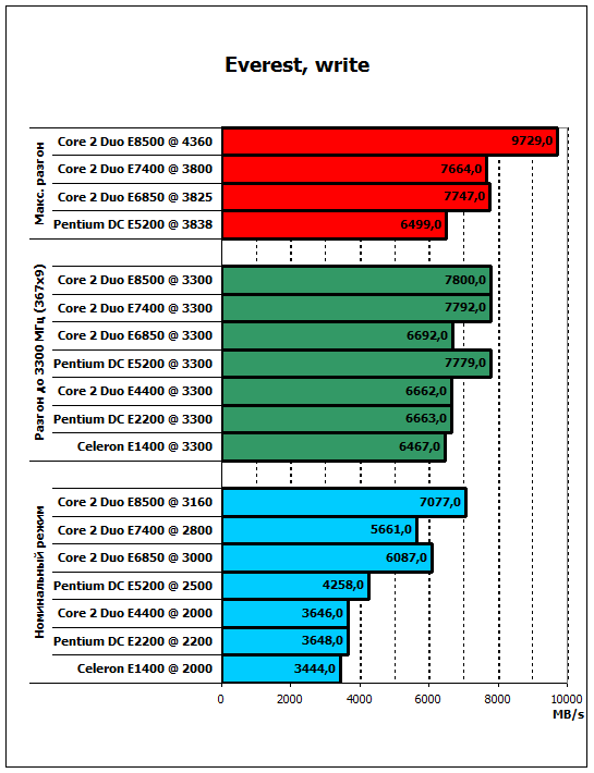 В целом, в данном тесте наибольшее влияние оказывает частота процессора. Разница в результатах между Core 2 Duo E6850 и E7400, а также E5200 и E4400 несущественна. Извечные аутсайдеры E1400 и E2200 не покидают своих позиций.