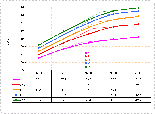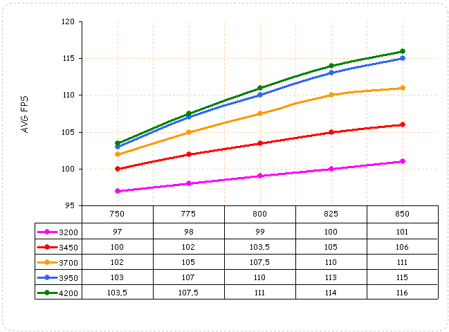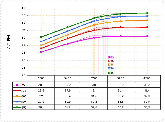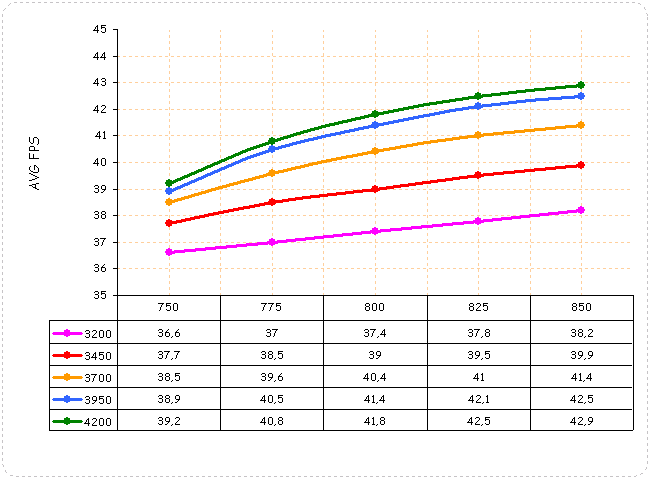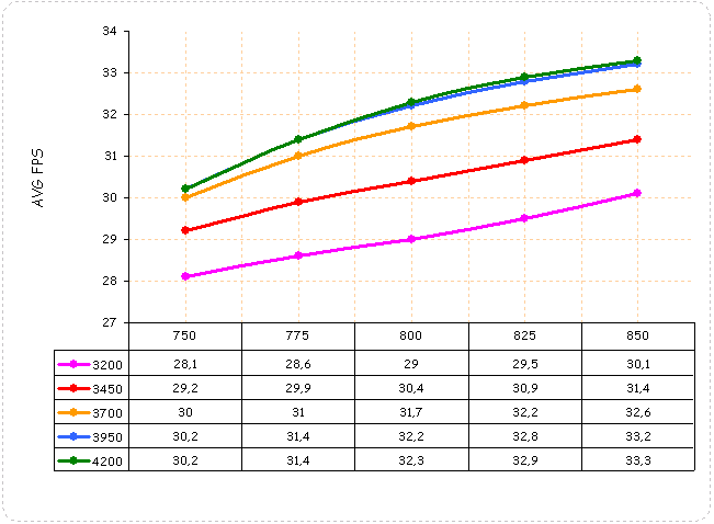 В Devil May Cry 4 мы вновь наблюдаем равномерный прирост производительности, при разгоне видеопамяти и графического ядра. Частоты, при которых видеокарта достигла оптимальной производительности, равны 825/3890 МГц.