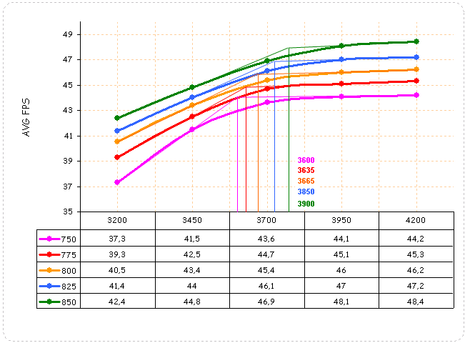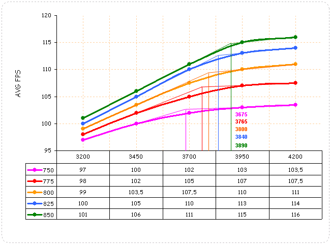 При детальном рассмотрении графика зависимости разгона графического ядра от частоты видеопамяти становится очевидным, что видеокарта уперлась в какое-то ограничение. Им может быть как мощность процессора, так и внутреннее ограничение самой игры.