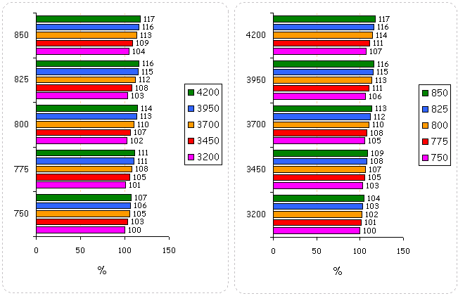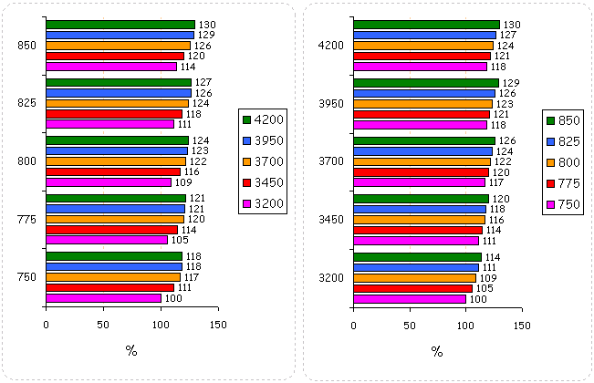Графики зависимости производительности видеокарты от разгона ядра и видеопамяти в процентном соотношении