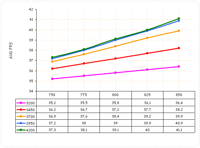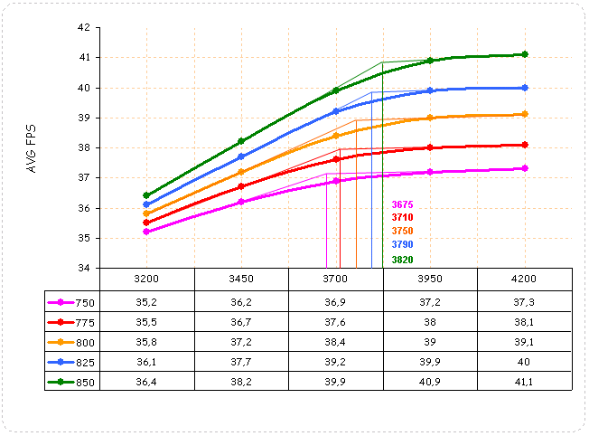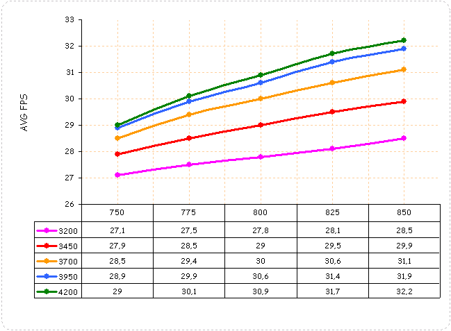 График зависимости разгона видеопамяти от частоты графического ядра