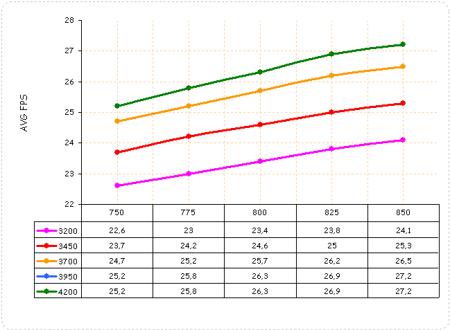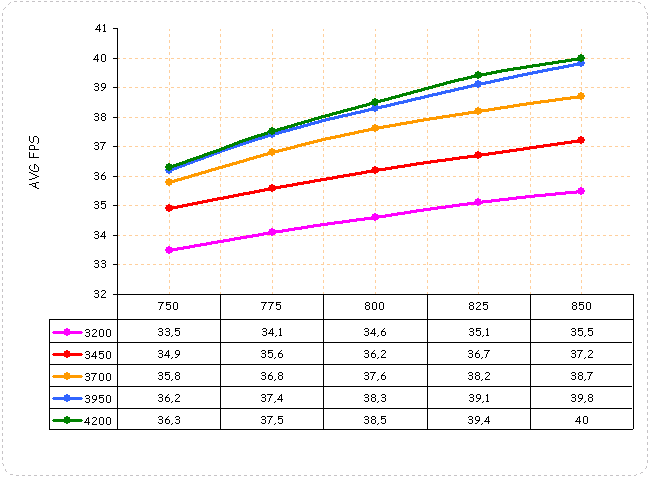 В World in Conflict: Soviet Assault производительность видеокарты росла вплоть до частот 825/3950 МГц. Повышение частот графического ядра сверх этих значений ничего не дало