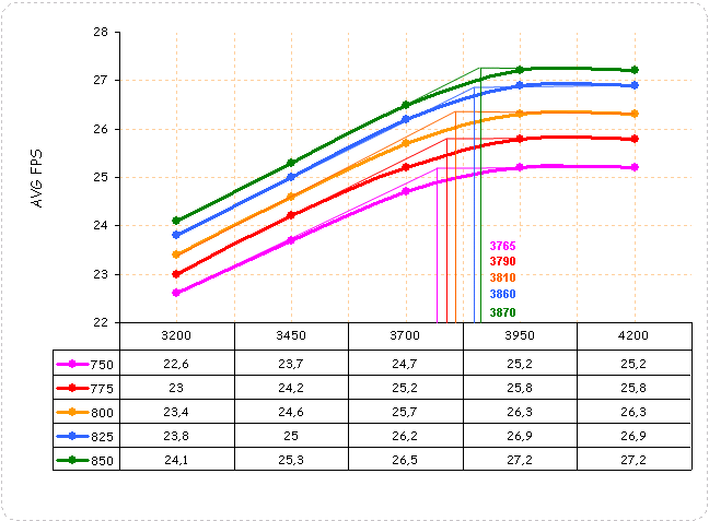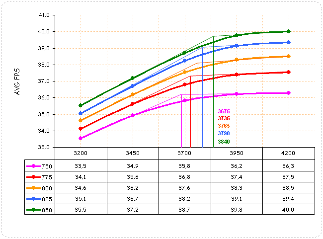 При рассмотрении количественной статистики мы видим, что у восьми протестированных игр из десяти рост производительности останавливается или дает минимальную величину при частотах видеокарты 825/3900 МГц.
