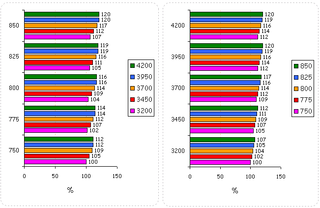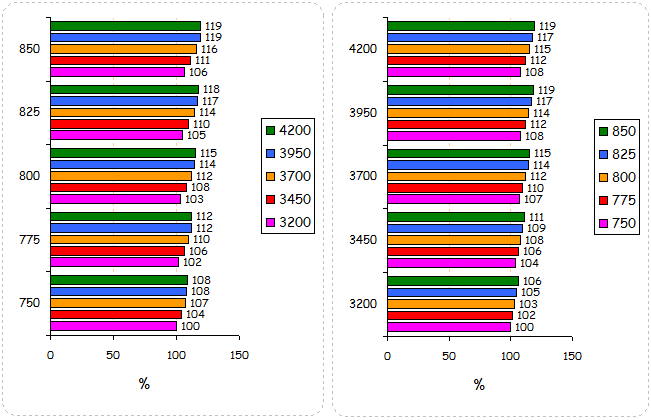 Графики зависимости производительности видеокарты от разгона ядра и видеопамяти в процентном соотношении