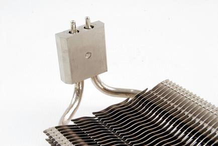 Радиатор состоит из 25 алюминиевых ребер затейливой формы нанизанных на одну медную никелированную тепловую трубку диаметром 6 мм, выходящую с двух сторон основания (также медного и никелированного). Тепловая трубка приклеена к основанию термоклеем. Жаль, что не применена пайка. Ребра радиатора оснащены перфорацией в виде довольно крупных отверстий прямоугольной формы с отогнутыми на 90 градусов лепестками. По словам разработчика, подобное конструктивное исполнение позволяет радиатору эффективнее отдавать тепло в окружающее пространство при работе в пассивном режиме или при тихом обдуве вентилятором. При использовании подобной перфорации надобность в большом воздушном потоке отпадает. Межреберное расстояние между пластинами составляет 2.5 мм: