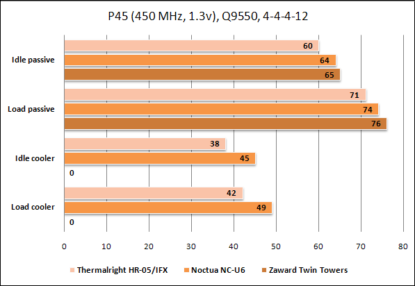 Как мы видим из диаграммы, в пассивном режиме лидирует кулер Thermalright HR-05/IFX, в простое у Noctua NC-U6 он выигрывает 4 градуса Цельсия, в загрузке разрыв сокращается до 3 градусов. Кулер Zaward Twin Towers проиграл остальным претендентам. Впрочем, разница в 3-5 градусов для северного моста не так критична.