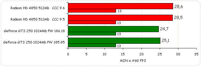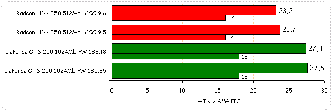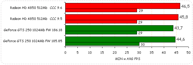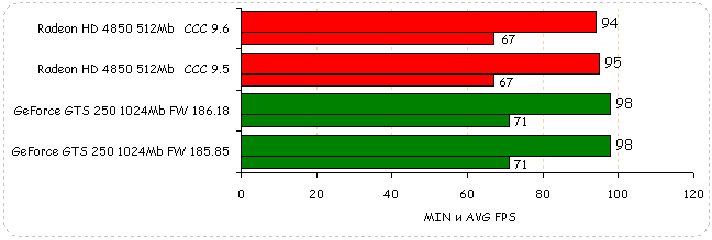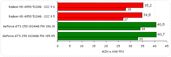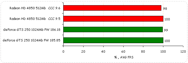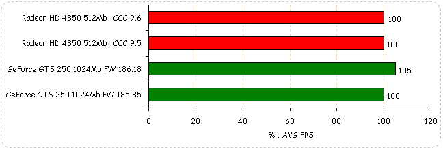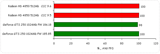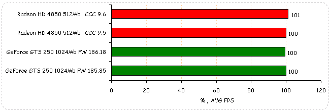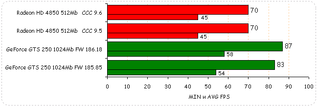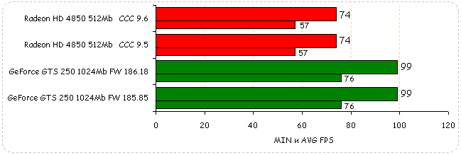 В Assasins Creed мы наблюдаем 2% прирост производительности у Radeon 4850, при переходе с Catalyst 9.5 на 9.6, и ее падение на те же 2% у GeForce GTS 250, в случае с обновлением драйверов NVIDIA.