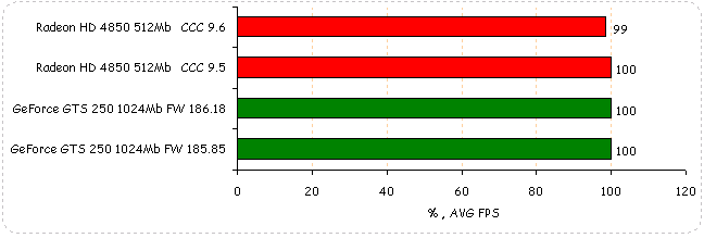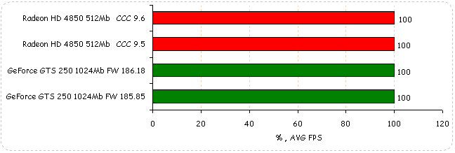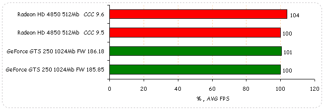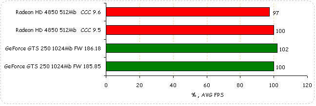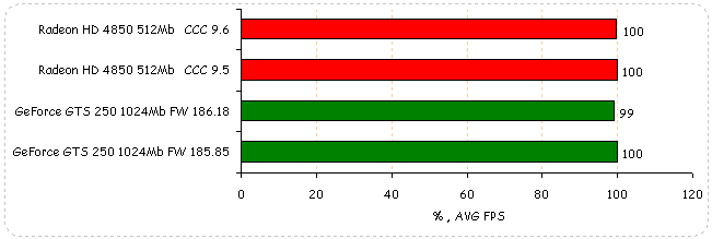 В World in Conflict: Soviet Assault производительность видеокарт обоих вендоров не изменяется, если не считать 1% падение у GeForce GTS 250.