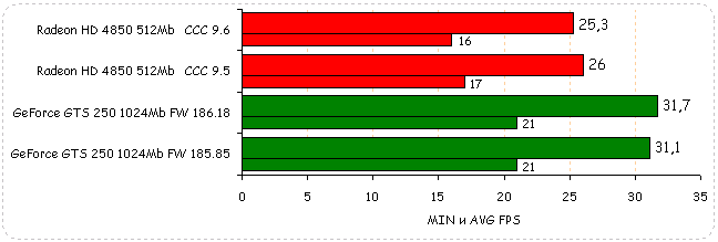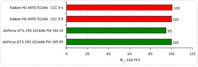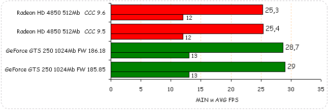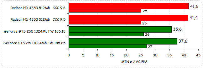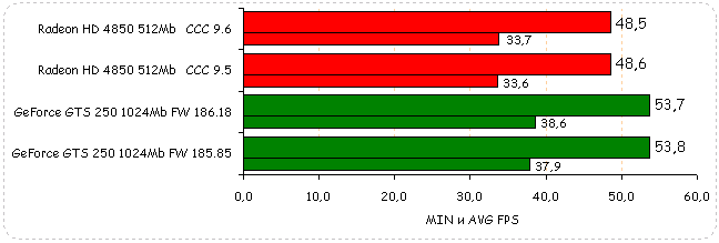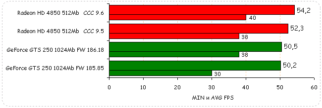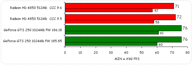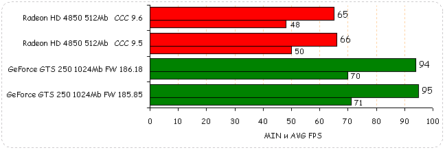 В Need for Speed: Pro Street производительность видеокарт обоих вендоров незначительно упала: у Radeon HD 4850 на 2%, у GeForce GTS 250 на незначительный 1%.