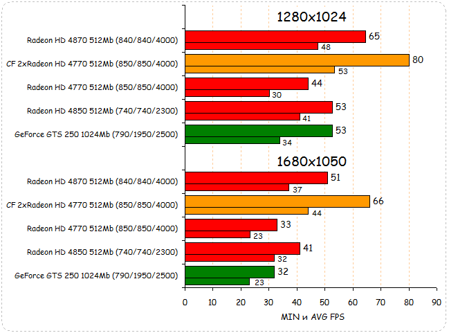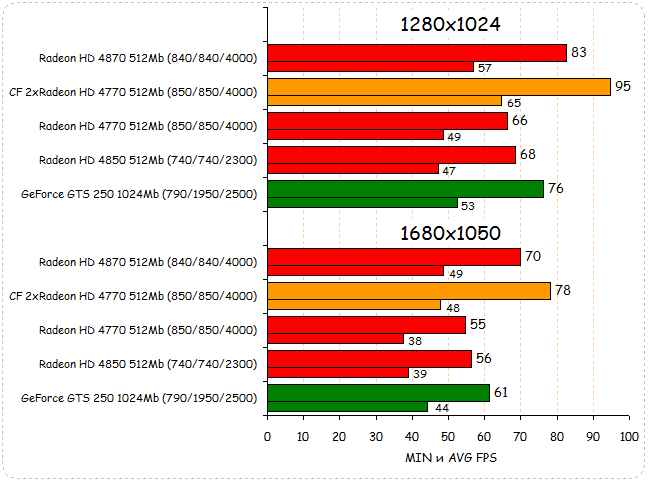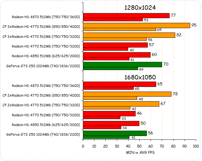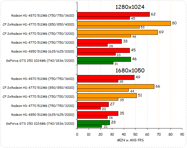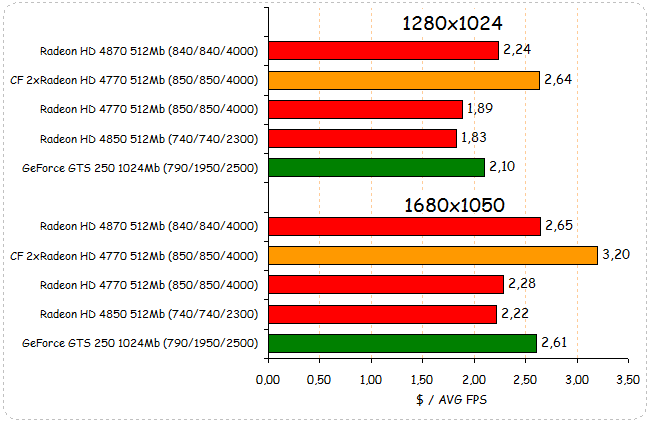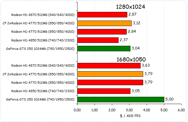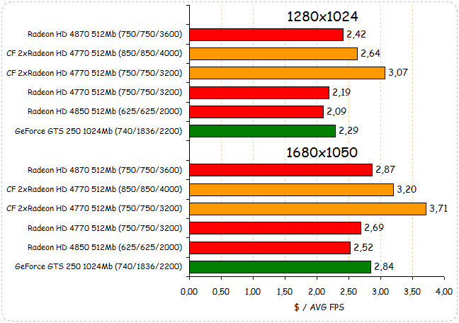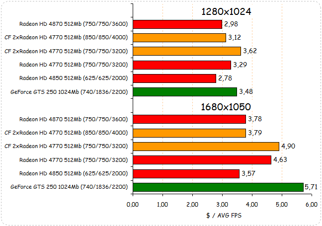 Как следствие из вышеуказанных причин поклонникам данной игры стоит покупать связку из двух Radeon HD 4770, так как кроме всего прочего эти видеокарты занимают неплохие позиции по соотношению цена/качество.