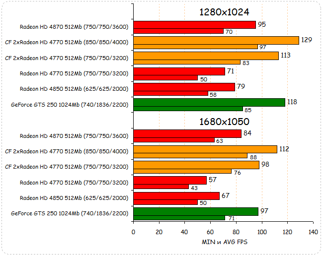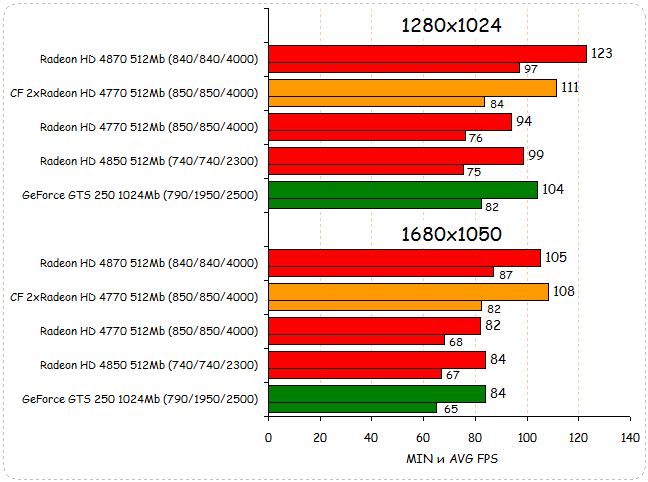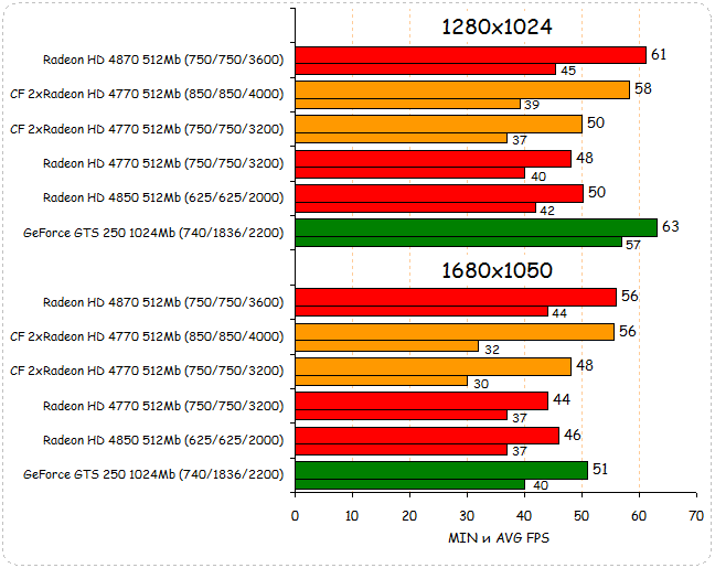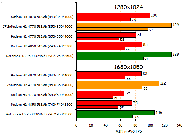 В Race Driver: GRID тандем из двух Radeon HD 4770 делит второе место с GeForce GTS 250 при разрешении 1280х1024. При переходе к разрешению 1680х1050 два Radeon HD 4770 уверенно обходят GeForce GTS 250 и наступают на пятки лидеру - Radeon HD 4870. За счет хорошего разгонного потенциала им удается выйти на первое место, обогнав при этом даже разогнанный Radeon HD 4870.