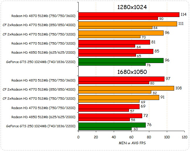 В Need for Speed: Pro Street отменную производительность показала GeForce GTS 250 - она смогла обогнать не только более мощный Radeon HD 4870, но и поспорить за лидерство с двумя Radeon HD 4770. Последние смогли догнать и перегнать видеокарту из зеленого лагеря только за счет хорошего разгонного потенциала.