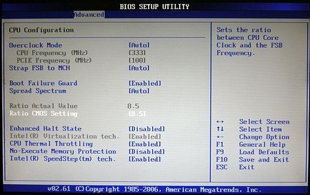 Процессор был выставлен на минимальный возможный множитель (6). Для достижения итогового результата понадобилось поднять напряжение на северном мосту до 1.35В, на процессоре до 1.35В, для перестраховки были немного увеличены PLL Voltage и напряжение на юге. Память, во избежание проблем работала с «отпущенными» таймингами (9-9-9-27) в режиме FSB:DRAM = 1:1 при вольтаже 1.7В (номинал 1.5В).