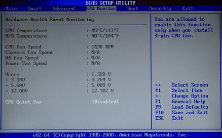 В разделе H/W Monitor мы можем в режиме реального времени контролировать температуру процессора и материнской платы, 3 основных напряжения и скорость вращения вентиляторов.