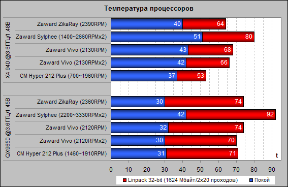 Итак, вот какую эффективность продемонстрировали кулеры Zaward и их конкурент на двух платформах (скорость вентиляторов кулеров указана по данным мониторинга):