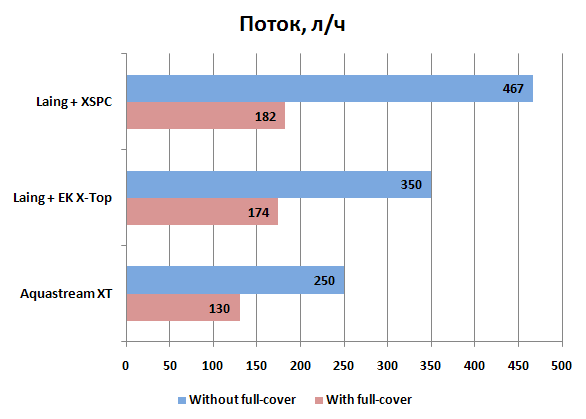 Особо стоит обратить внимание на комбинацию Laing + XSPC в контуре с небольшим сопротивлением. После старта T-Balancer начал истошно пищать, сообщая о Flowmwter error, показывал значение расхода в 466,5 л/ч (именно при значениях выше этого раздаются сигналы тревоги, изменить его мне не удалось), потом начал показывать значения в пределах 20 л/ч. Есть у меня догадка, что эти последние значения надо прибавлять к 466,5, но ничто эту догадку не подтверждает. В любом случае, разница в расходе между той же самой помпой, но с крышкой от ЕК, и данной комбинацией колоссальна. Никогда бы не подумал, что примитивный бачок может оказывать такое сопротивление потоку. Другая крайность - Aquastream XT в контуре с фуллкавером, отнюдь, казалось бы, не самом сложном, но расход составил всего 133 л/ч. В дальнейшем усложнении контура смысла после такого показателя я не увидел.