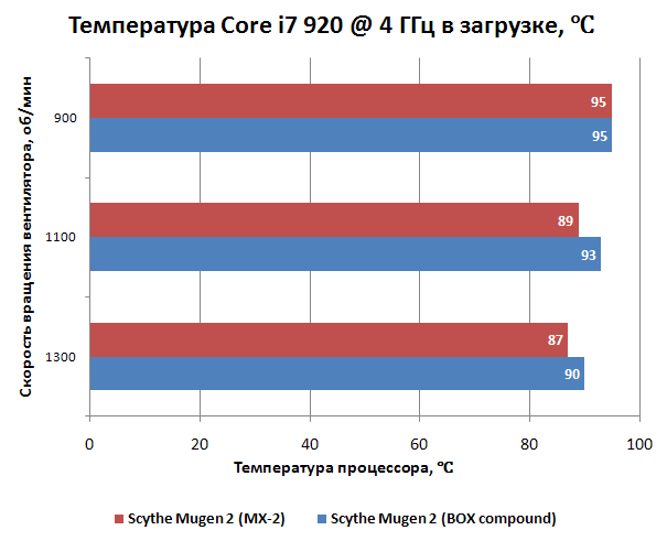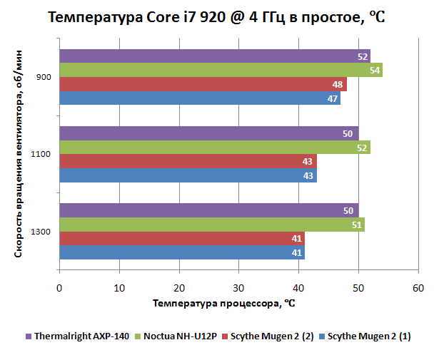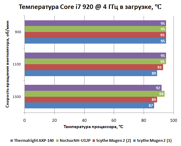 "Scythe Mugen 2 (1)" - график для кулера с традиционно установленным вентилятором (на широкую сторону радиатора), "Scythe Mugen 2 (2)" - график для кулера с вентилятором, установленным на торец радиатора. По цифрам - Mugen 2 опережает обеих конкурентов на 6-10 градусов. При этом, услышать работу Mugen 2 начиная от 1100 об/мин даже сидя рядом со стендом не удается. Отличный результат!