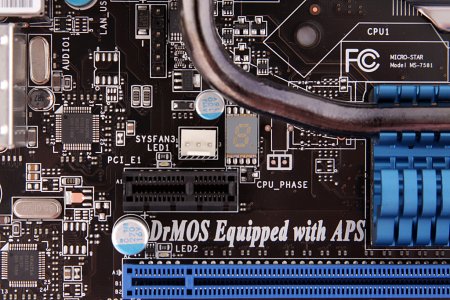 Данная материнская плата поддерживает технологию энергосбережения APS (Active Phase Switching), то есть умеет динамически переключать количество задействованных фаз. Для количества задействованных фаз в системе питания процессора (Vcore) рядом с верхним слотом PCI-E x1 установлен индикатор: