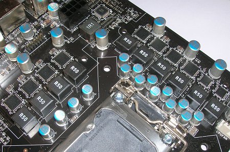 Все установленные на плате конденсаторы - твердотельные. Вместо традиционных мосфетов в системе питания процессора, памяти и чипсета используются микросхемы DrMOS (Driver-MOSFET). DrMOS в одном корпусе сочетают функции нижнего и верхнего мосфетов, а так же управляющей ими микросхемы. Это экономит место на материнской плате и приводит к снижению тепловыделения системой питания. На MSI P55-GD80 в качестве DrMOS используются восемь микросхем RENESAS R2J20602 на напряжении Vcore: