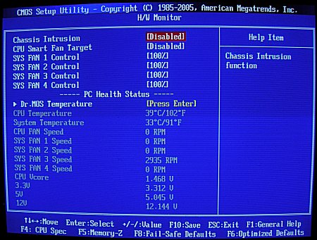 В разделе H/W Monitor можно управлять оборотами вентиляторов, подключенных к разъёмам CPU FAN и SYS FAN, посмотреть температуру процессора и системы, напряжения на процессоре (Vcore) и на линиях блока питания (+3.3V, +5V, +12V), а так же обороты вентиляторов: