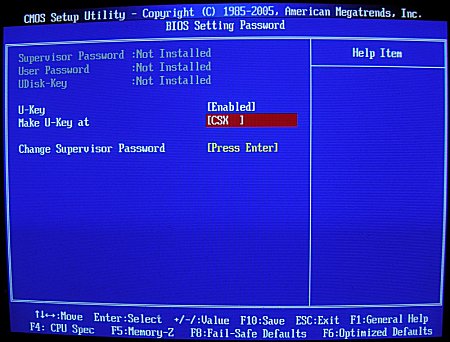 Технология U-Key позволяет использовать flash-drive (или любое другое USB-устройство класса Mass Storage Device) как ключ для доступа к вашему компьютеру. Работает это так: вы вставляете flash-drive, помечаете его как ключ (пункт Make U-Key at) и при следующем запуске, если этот же flash-drive не будет подключен к компьютеру - BIOS не позволит вам его загрузить. Конечно, все это имеет смысл только в том случае, если нет доступа к системному блоку и кнопке сброса настроек BIOS. Отличие от традиционного метода только в том, что вам не нужно запоминать пароль.