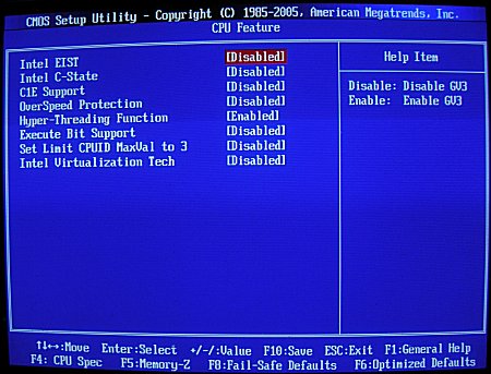 В подразделе CPU Feature можно включить или отключить энергосберегающие технологии, Hyper Threading, технологии виртуализации, функцию Execute Disable Bit и "защиту от разгона" (OverSpeed Protection):