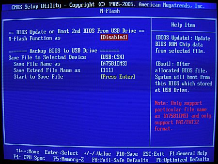 В разделе M-Flash можно сохранить образ BIOS на устройство подключенное к USB (flash-drive и т.п.), включить возможность загрузки с ранее сохраненного образа BIOS или обновить его, указав на файл с новым образом: