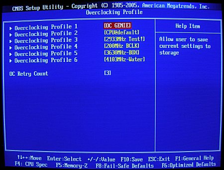 В разделе Overclocking Profile можно сохранить текущие настройки BIOS в один из шести профилей и дать им описания: