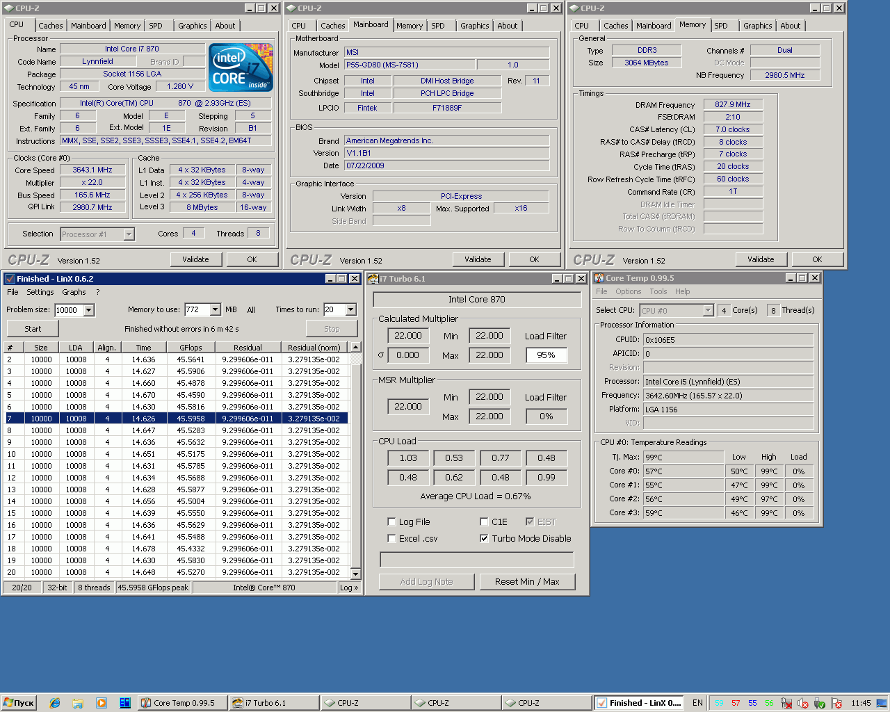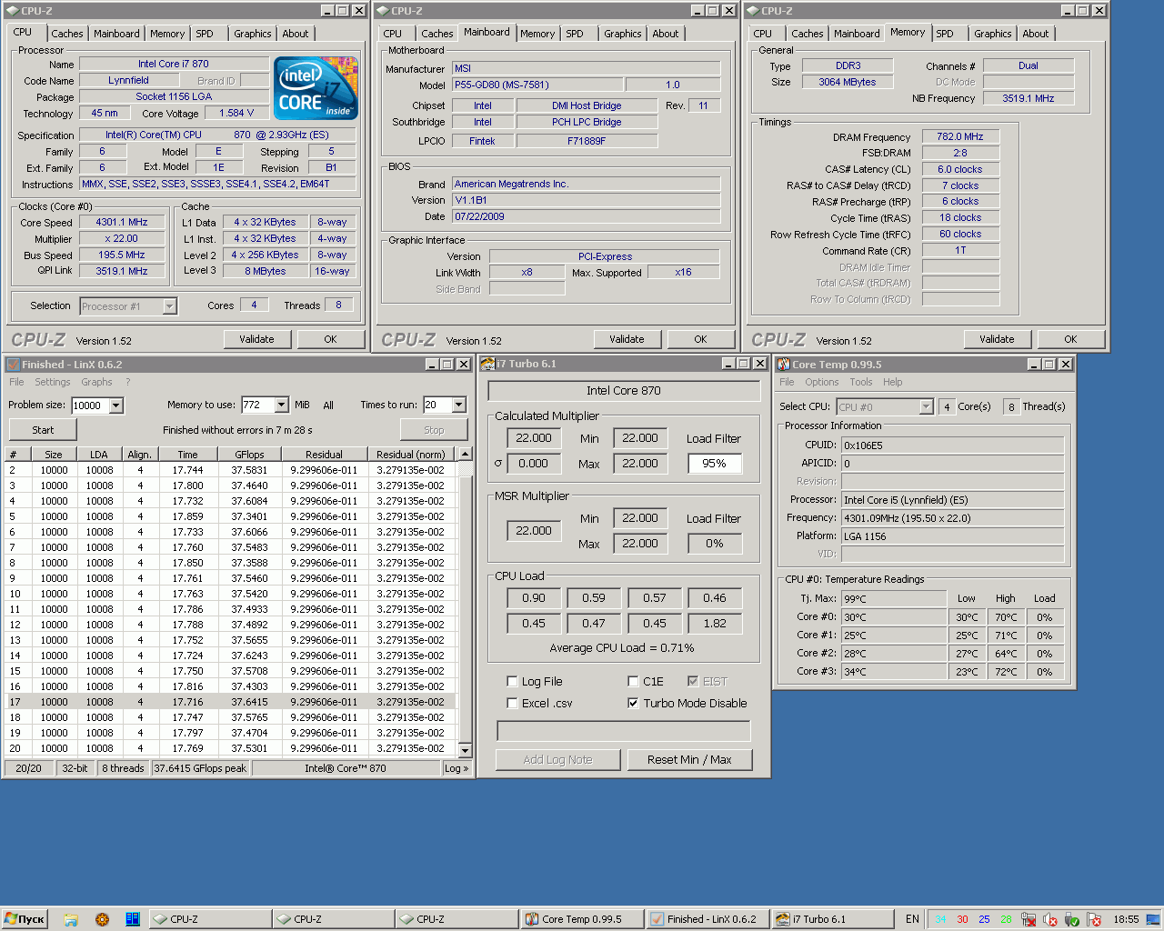 Для проверки стабильности использовалась программа LinX v0.6.2. Минимальные и максимальные температуры ядер фиксировались программой Core Temp v0.99.5.26. Для мониторинга множителя процессора использовалась программа i7 Turbo v6.1, чтобы убедится в том, что во время проверки он не снижался. В операционной системе был установлен профиль питания "Высокая производительность".