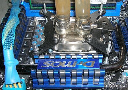 Чтобы обеспечить стабильную работу с частотой BCLK 208 МГц процессор охлаждался проточной холодной водой. Память охлаждалась 92-мм вентилятором. Напряжения, при которых был получен этот результат, были следующие: