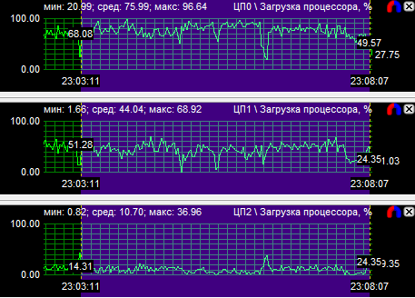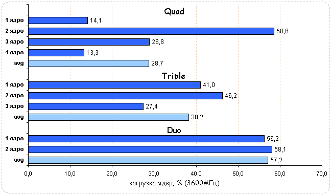 Диаграммы загрузки процессоров показали, что в этой игре у тестируемых процессоров нагружены все ядра, но эта нагрузка неравномерна. Средняя загрузка четырехъядерного процессора - 28,7%, трехъядерного - 38,2% и двухъядерного - 57,2%.