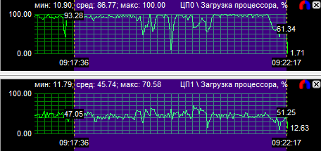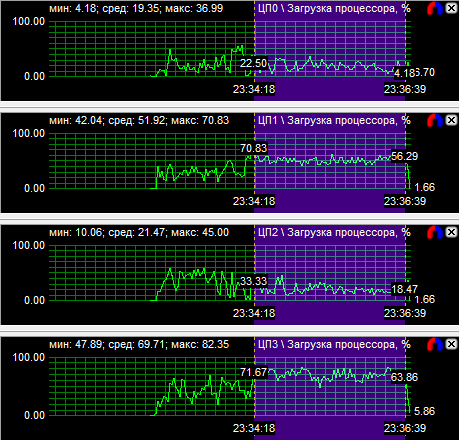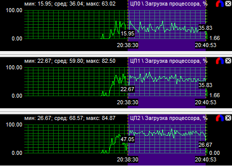 Диаграммы загрузки процессоров показали, что игра World in Conflict: Soviet Assault оптимизирована под многоядерные процессоры - нагрузка на тестируемые CPU равномерная. Средняя загрузка четырехъядерного процессора равна 62,3%, трехъядерного - 82,2% и двухъядерного - 94,2%. Такая серьезная нагрузка на процессоры, работающие на максимальной частоте, указывает на то что игра процессорозависима.